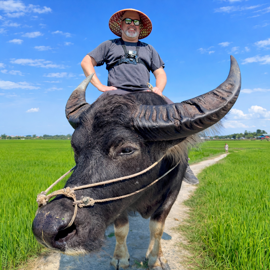The short scooter ride through the rice fields alone was worth it, but the water buffalo himself was a magnificent beast. Huge, calm, mildly comical, and deeply unimpressed by all of us. Riding him mostly involved climbing on, grinning like idiots, and being led in a tiny circle for a photo op. It was silly tourist nonsense. And the photo I got of Vance on top of that buffalo? Worth every penny.