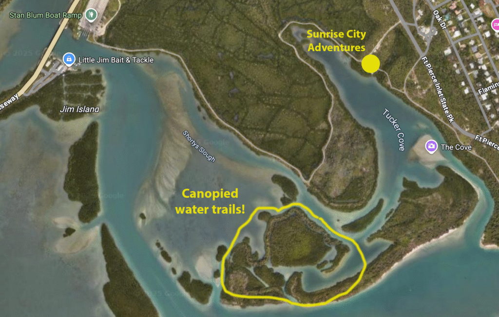 Below is a map with the canopied water trails circled. The Sunrise City Adventures launch spot is also marked for reference.