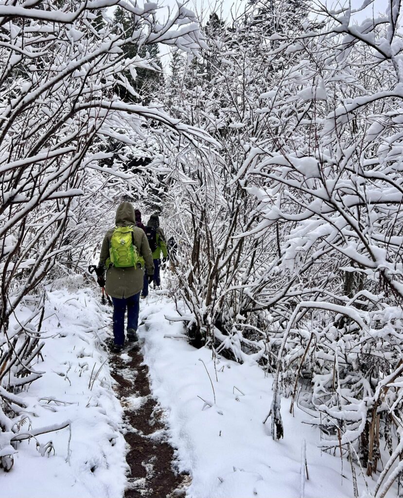Snow softened the trail but didn’t yet require snowshoes or traction. We got lucky.